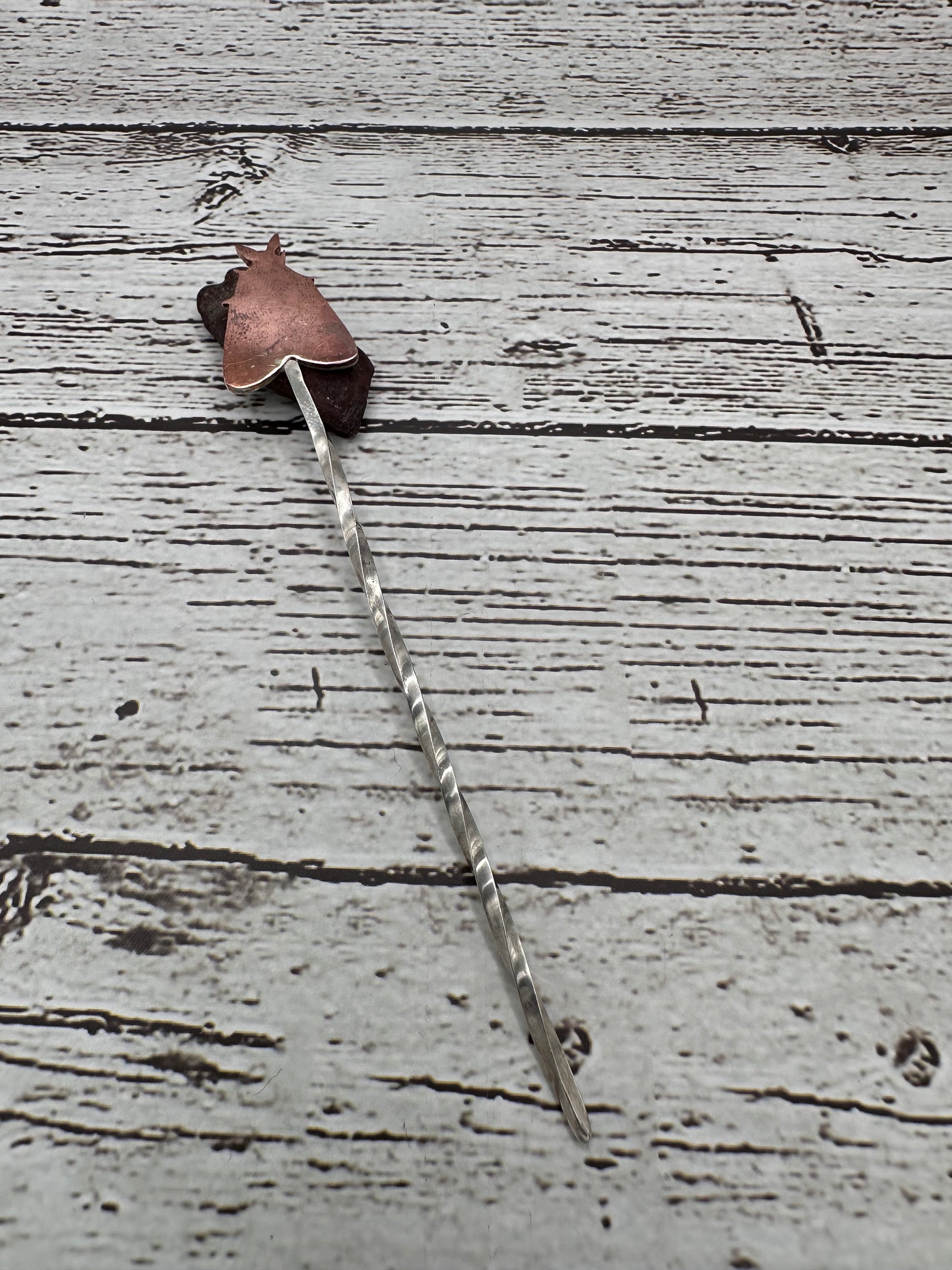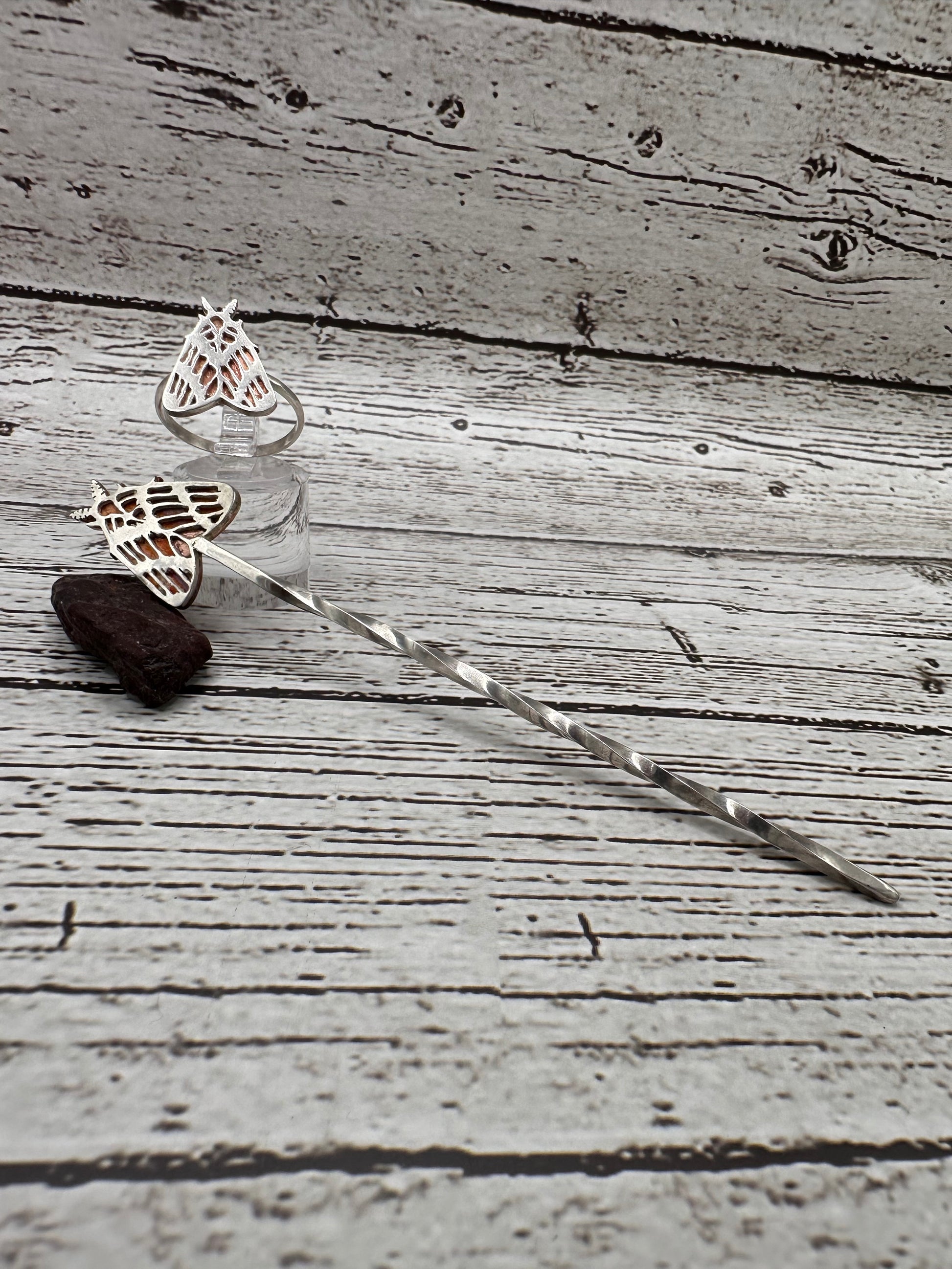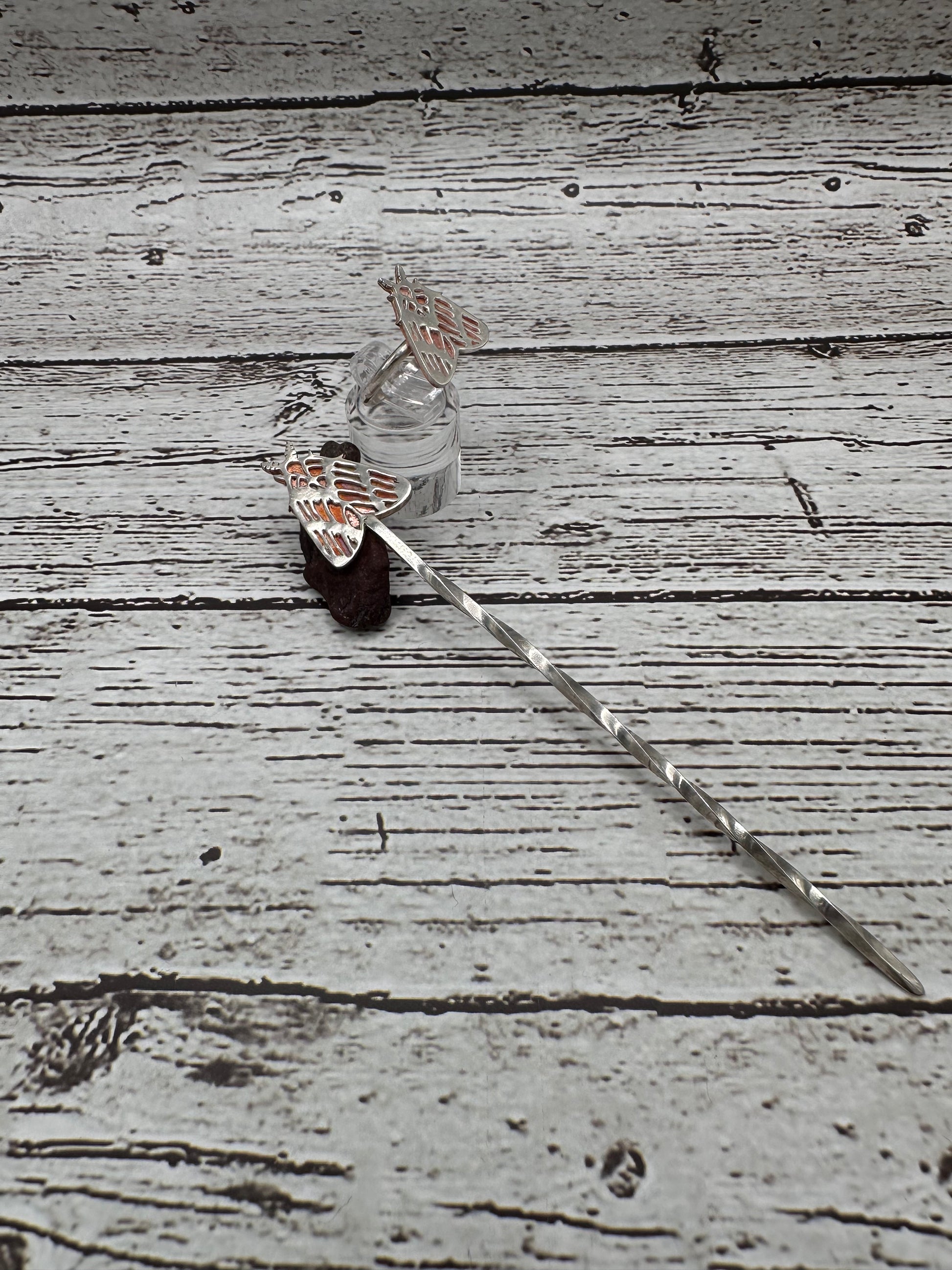 The Hair Pin is 4“ long twisted Sterling with a 3/4” by 1” Moth