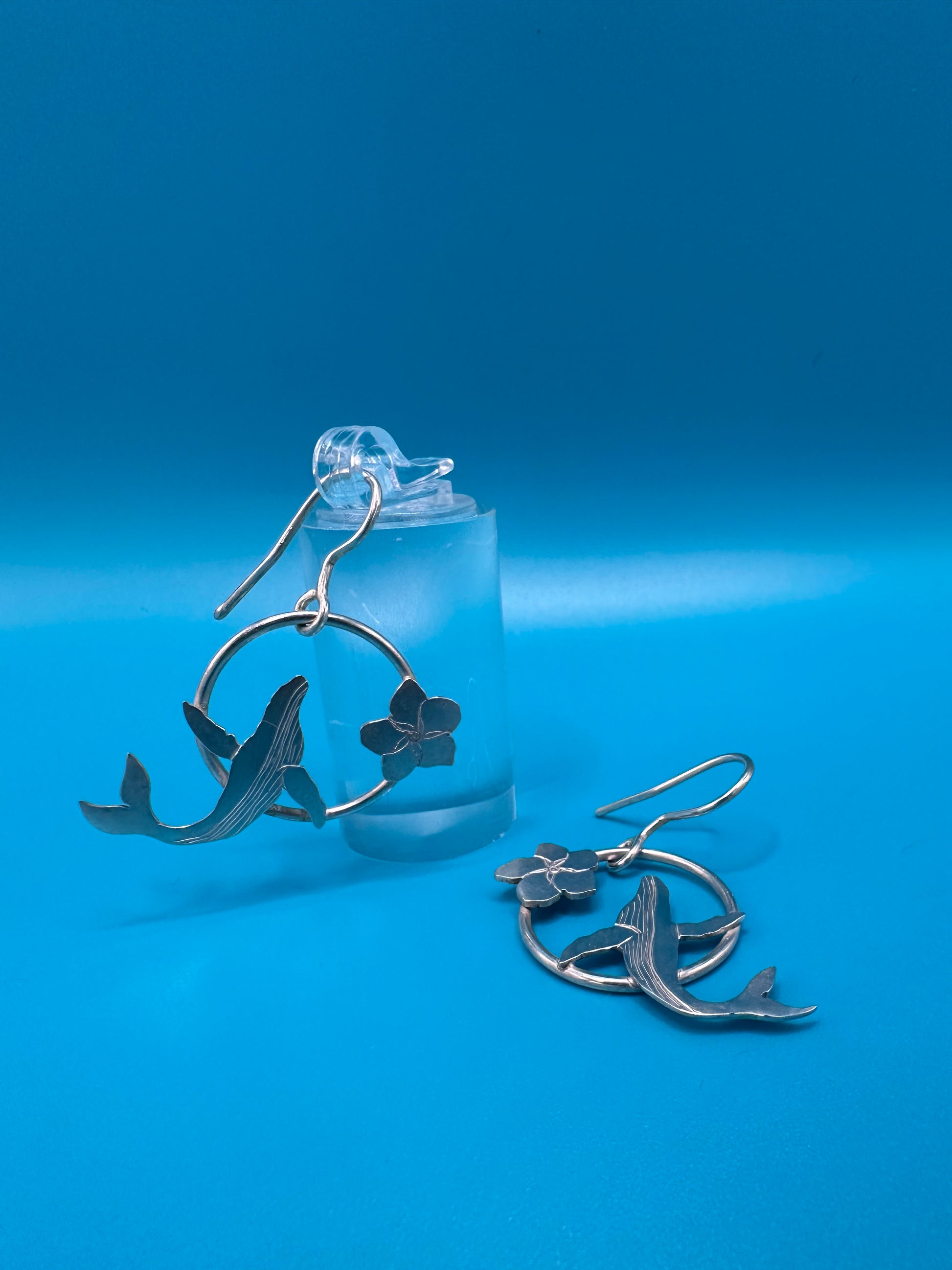These happy Little Breaching Whales with Forget-me-nots are made of 925 Sterling silver. They dangle at just over 1 1/2” from the top of the ear wire to the bottom of the whale. They are fairly light at less than a 10th of an ounce each. Sold as a set.